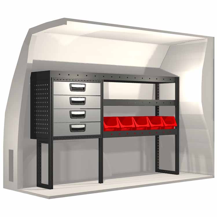 The racking has been specially designed to ensure the optimum fit to the vehicle, as well as the best possible functionality and safety. It has been developed for professional use, is flexible and is intended for service jobs in various types of business. All shelves are equipped with rubber mats, and all drawers with foam plastic liners. Assembly material is included.