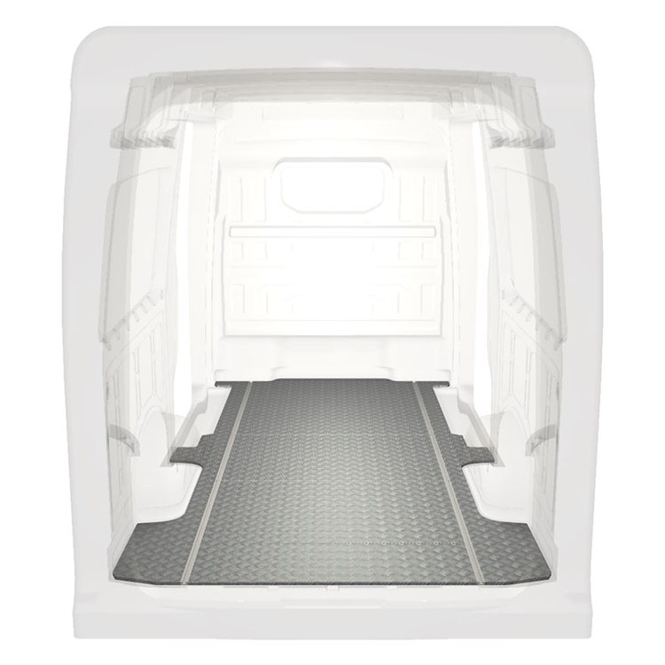Lehká a robustní standardní podlaha do dodávky Volkswagen Crafter / MAN TGE s protiskluzovou hliníkovou deskou a nákladními kolejnicemi (podélnými) pro rychlou a bezpečnou montáž regálových systémů a dalšího příslušenství.
