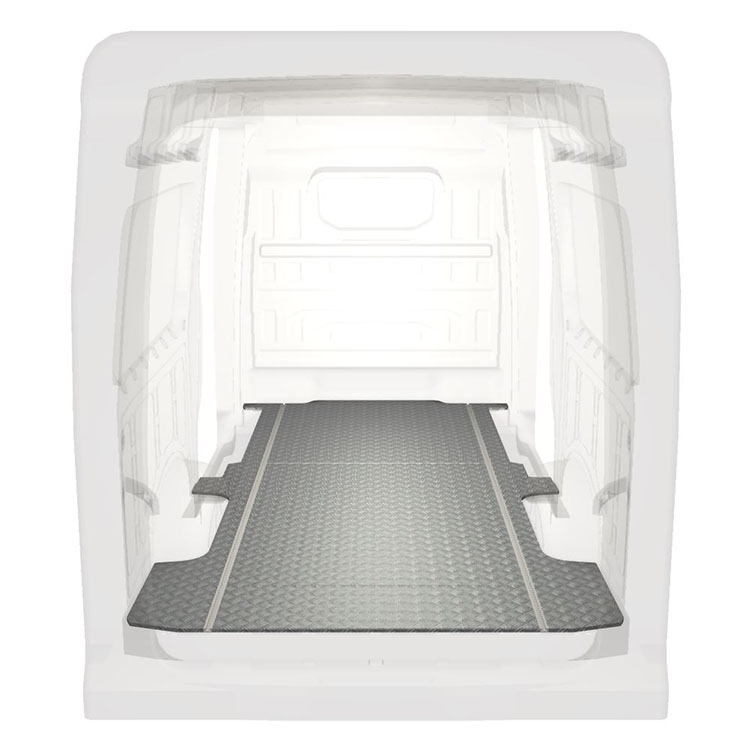 Lehká a robustní standardní podlaha do dodávky Volkswagen Crafter / MAN TGE s protiskluzovou hliníkovou deskou a nákladními kolejnicemi (podélnými) pro rychlou a bezpečnou montáž regálových systémů a dalšího příslušenství.
