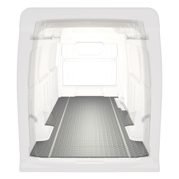 Lehká a robustní standardní podlaha do dodávky Volkswagen Crafter / MAN TGE s protiskluzovou hliníkovou deskou a nákladními kolejnicemi (podélnými) pro rychlou a bezpečnou montáž regálových systémů a dalšího příslušenství.