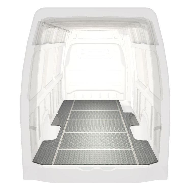 Lehká a robustní podlaha s příčnými kolejnicemi pro dodávky Mercedes Sprinter s protiskluzovou hliníkovou deskou a nákladními kolejnicemi (podélnými a příčnými) pro rychlou a bezpečnou montáž regálových systémů a dalšího příslušenství.