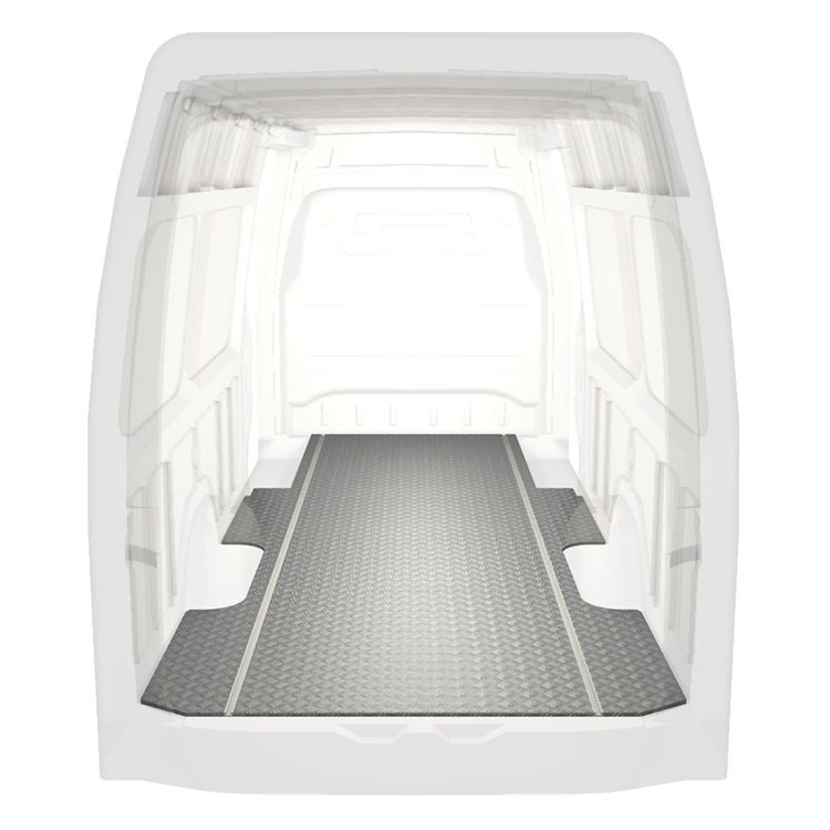 Lehká a robustní extra dlouhá podlaha pro dodávky Mercedes Sprinter s protiskluzovou hliníkovou deskou a nákladními kolejnicemi (podélnými) pro rychlou a bezpečnou montáž regálových systémů a dalšího příslušenství.