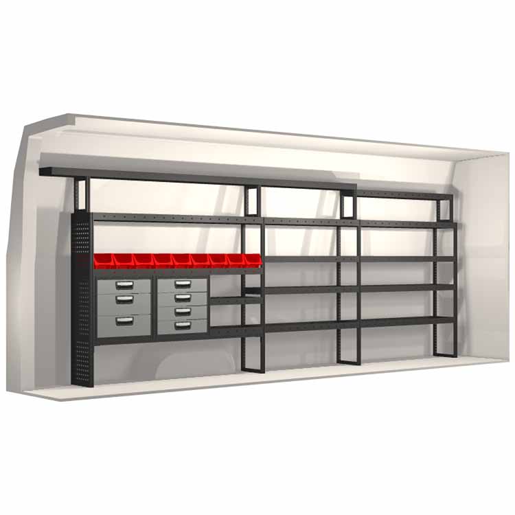 The racking has been specially designed to ensure the optimum fit to the vehicle, as well as the best possible functionality and safety. It has been developed for professional use, is flexible and is intended for service jobs in various types of business. All shelves are equipped with rubber mats, and all drawers with foam plastic liners. Assembly material is included.