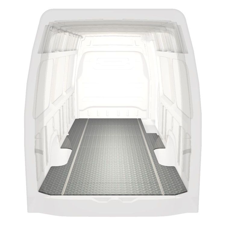 Lehká a robustní standardní podlaha do dodávky Mercedes Sprinter s protiskluzovou hliníkovou deskou a nákladními kolejnicemi (podélnými) pro rychlou a bezpečnou montáž regálových systémů a dalšího příslušenství.