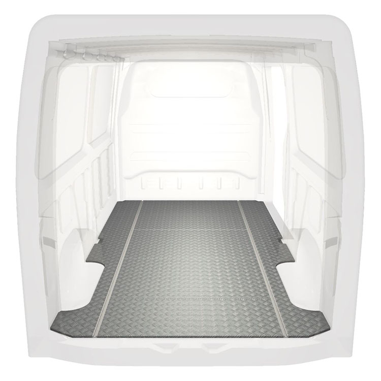 Lehká a robustní standardní podlaha do dodávky Mercedes Sprinter s protiskluzovou hliníkovou deskou a nákladními kolejnicemi (podélnými) pro rychlou a bezpečnou montáž regálových systémů a dalšího příslušenství.