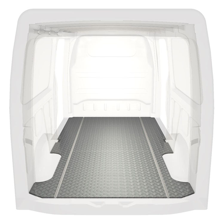 Lehká a robustní standardní podlaha do dodávky Mercedes Sprinter s protiskluzovou hliníkovou deskou a nákladními kolejnicemi (podélnými) pro rychlou a bezpečnou montáž regálových systémů a dalšího příslušenství.