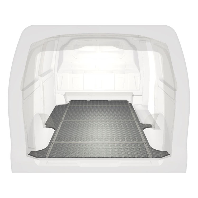 Lehká a robustní podlaha s příčnými kolejnicemi pro dodávky Mercedes Vito s protiskluzovou hliníkovou deskou a nákladními kolejnicemi (podélnými a příčnými) pro rychlou a bezpečnou montáž regálových systémů a dalšího příslušenství.