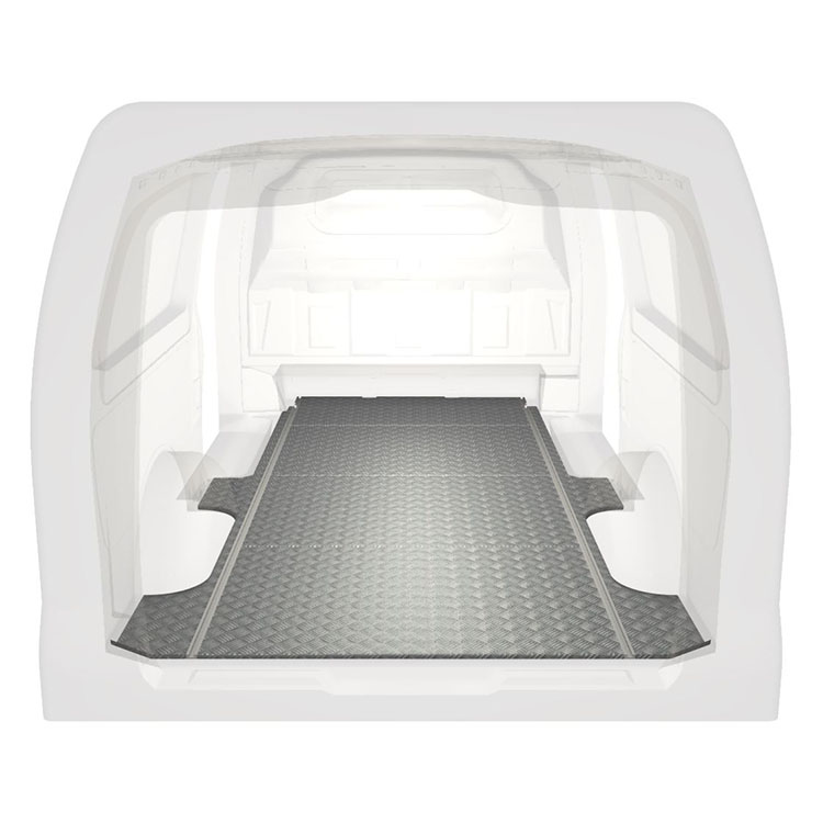 Lehká a robustní standardní podlaha do dodávky Mercedes Vito s protiskluzovou hliníkovou deskou a nákladními kolejnicemi (podélnými) pro rychlou a bezpečnou montáž regálových systémů a dalšího příslušenství.