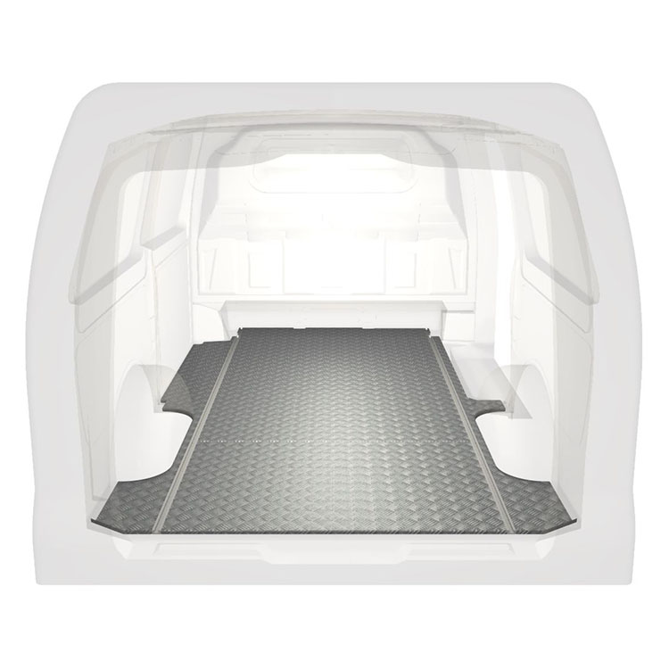 Lehká a robustní standardní podlaha do dodávky Mercedes Vito s protiskluzovou hliníkovou deskou a nákladními kolejnicemi (podélnými) pro rychlou a bezpečnou montáž regálových systémů a dalšího příslušenství.