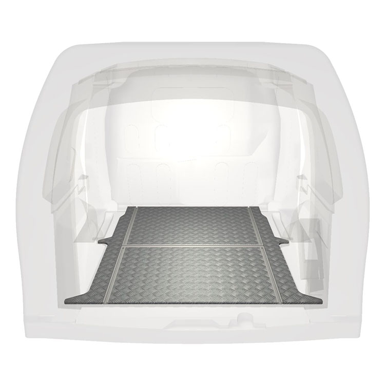 Lehká a robustní podlaha s příčnými kolejnicemi pro dodávky Mercedes Citan / Renault Kangoo s protiskluzovou hliníkovou deskou a nákladními kolejnicemi (podélnými a příčnými) pro rychlou a bezpečnou montáž regálových systémů a dalšího příslušenství.
