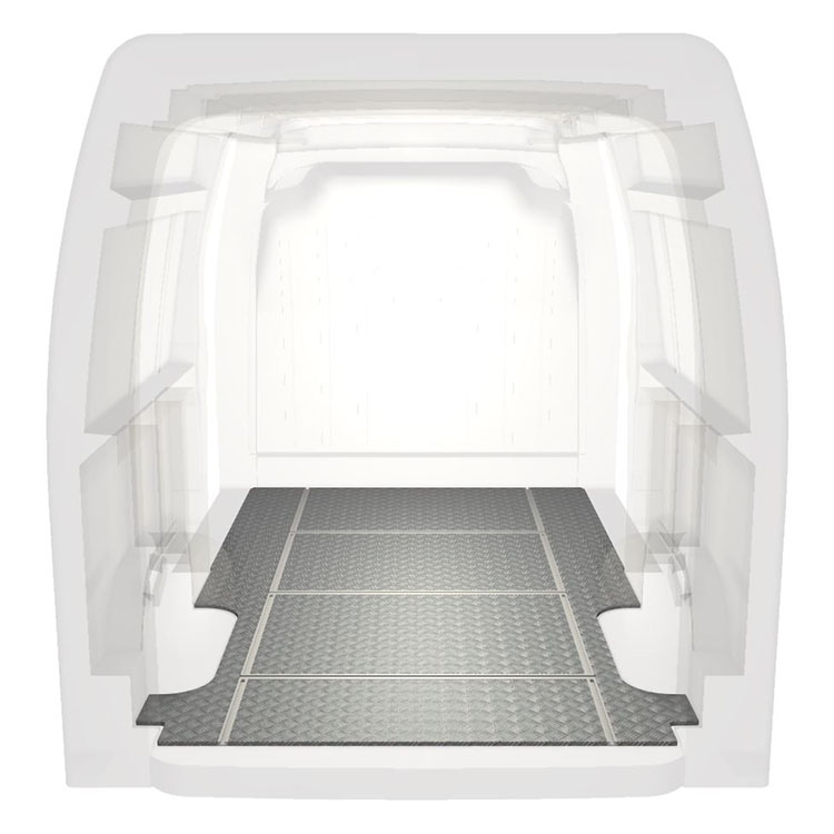 Lehká a robustní podlaha s příčnými kolejnicemi pro dodávky Renault Master / Opel Movano / Nissan NV400 s protiskluzovou hliníkovou deskou a nákladními kolejnicemi (podélnými a příčnými) pro rychlou a bezpečnou montáž regálových systémů a dalšího příslušenství.