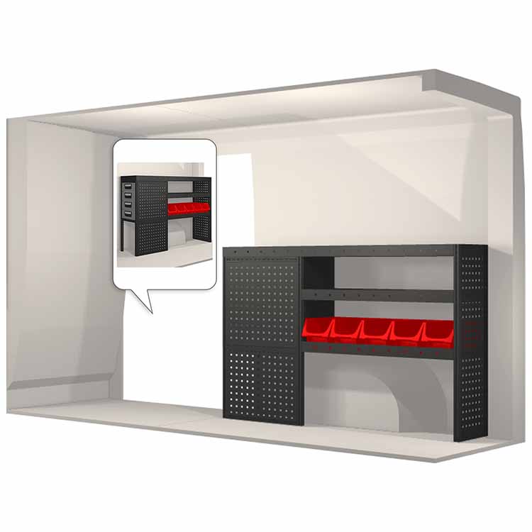 The racking has been specially designed to ensure the optimum fit to the vehicle, as well as the best possible functionality and safety. It has been developed for professional use, is flexible and is intended for service jobs in various types of business. All shelves are equipped with rubber mats, and all drawers with foam plastic liners. Assembly material is included.