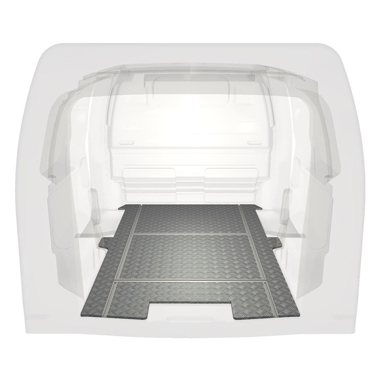 Lehká a robustní podlaha s příčnými kolejnicemi pro dodávky Citroën Jumpy / Peugeot Expert / Toyota ProAce s protiskluzovou hliníkovou deskou a nákladními kolejnicemi (podélnými a příčnými) pro rychlou a bezpečnou montáž regálových systémů a dalšího příslušenství.