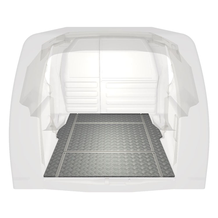 Lehká a robustní podlaha s příčnými kolejnicemi pro dodávky Citroën Berlingo / Peugeot Partner s protiskluzovou hliníkovou deskou a nákladními kolejnicemi (podélnými a příčnými) pro rychlou a bezpečnou montáž regálových systémů a dalšího příslušenství.