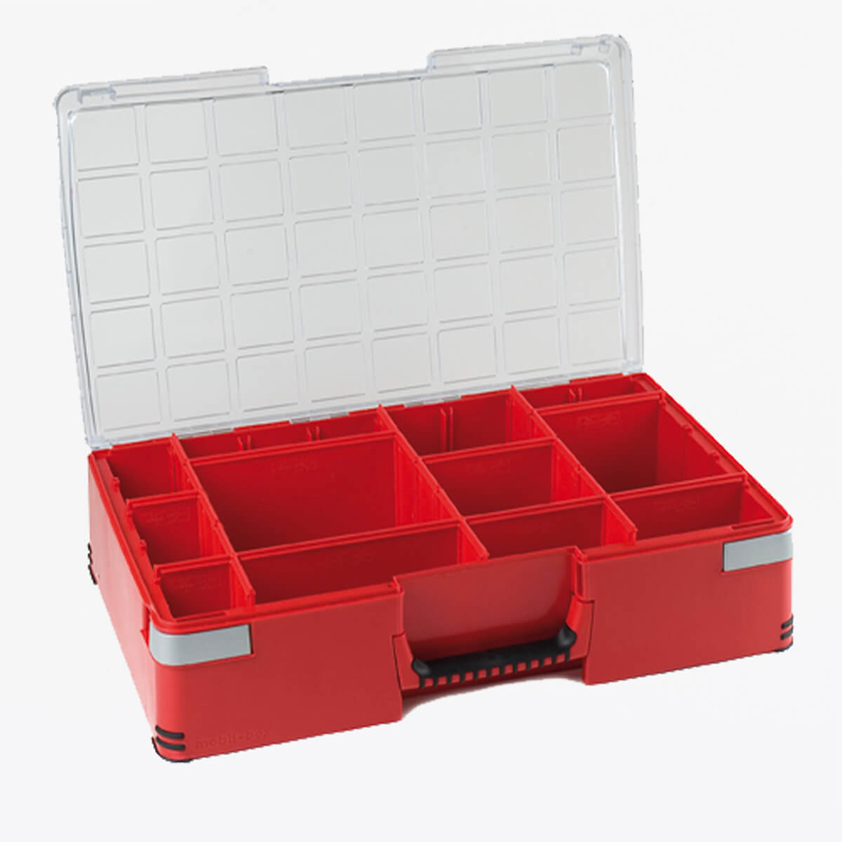 The Mobil-Box is a very practical storage case with an attractive design and smart, modular inserts. It is lightweight, versatile, and highly impact-resistant, with rubberized corners and handle. The Mobil-Box is resistant to most oils, acids, and chemicals, and can be placed in a drawer unit frame during transport for maximum safety.