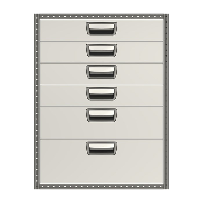 Each drawer is fitted with ball bearing runners as standard, and has a load capacity of 30 kg with a maximum of 100 kg per drawer unit. The drawers are fully extendable and equipped with stoppers. For maximum utility, the drawer unit can be equipped with accessories such as foam plastic liners, plastic inserts and dividers. To help optimize the weight, cover panels and tool boards are optional.