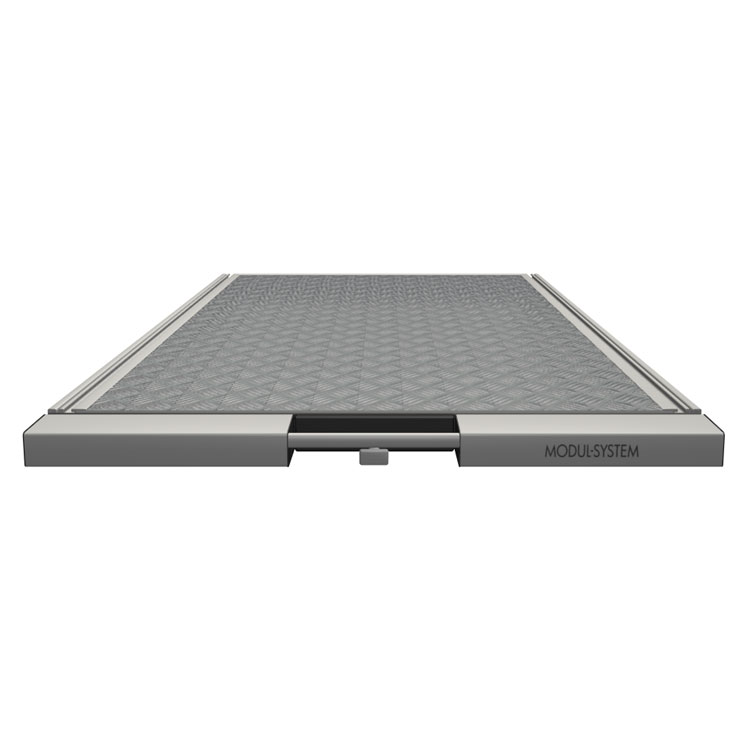 Lightweight and robust base frame made from ultra-high strength steel, with a front in anodized aluminum and a loading platform in lightweight sandwich material with an aluminum top.