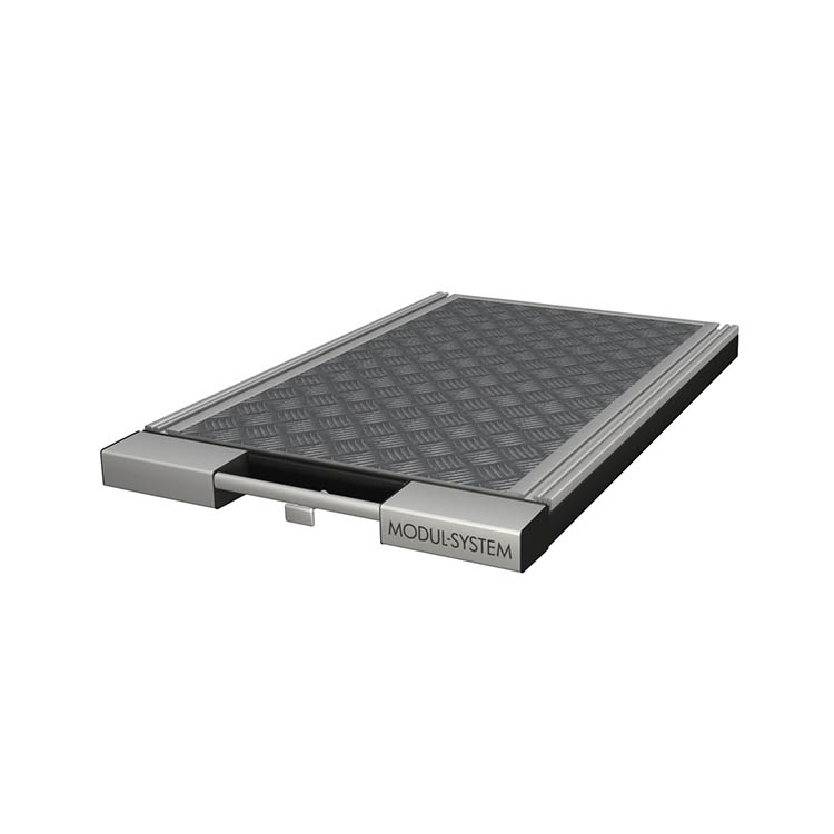 Lightweight and robust base frame made from ultra-high strength steel, with a front in anodized aluminum and a loading platform in lightweight sandwich material with an aluminum top.