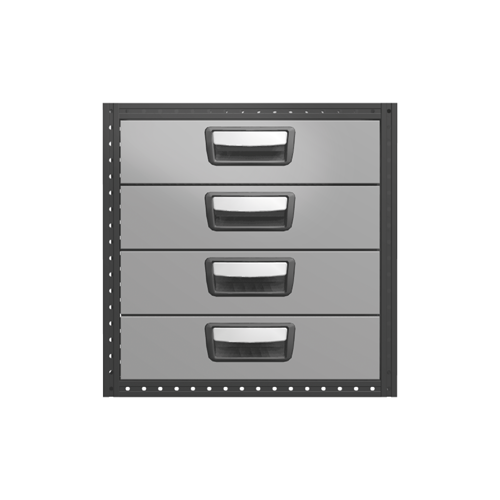 Each drawer is fitted with ball bearing runners as standard, and has a load capacity of 30 kg with a maximum of 100 kg per drawer unit. The drawers are fully extendable and equipped with stoppers. For maximum utility, the drawer unit can be equipped with accessories such as foam plastic liners, plastic inserts and dividers. To help optimize the weight, cover panels and tool boards are optional.