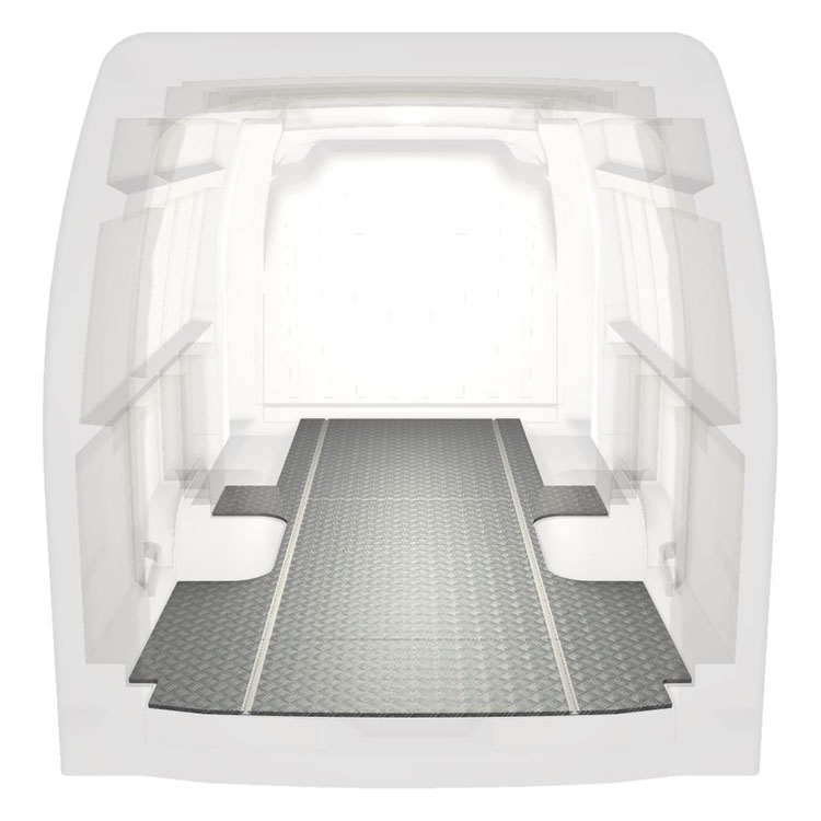 Lehká a robustní standardní podlaha do dodávky Renault Master / Opel Movano / Nissan NV400 s protiskluzovou hliníkovou deskou a nákladními kolejnicemi (podélnými) pro rychlou a bezpečnou montáž regálových systémů a dalšího příslušenství.