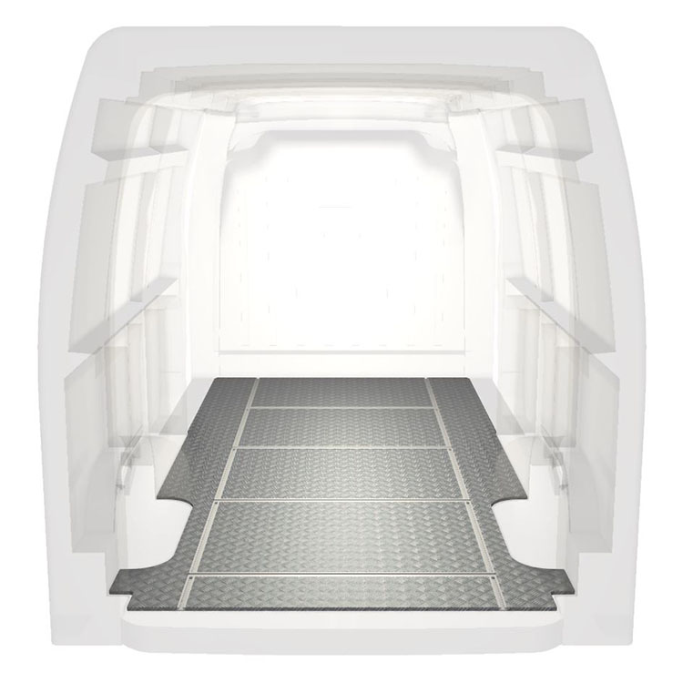 Lehká a robustní podlaha s příčnými kolejnicemi pro dodávky Renault Master / Opel Movano / Nissan NV400 s protiskluzovou hliníkovou deskou a nákladními kolejnicemi (podélnými a příčnými) pro rychlou a bezpečnou montáž regálových systémů a dalšího příslušenství.