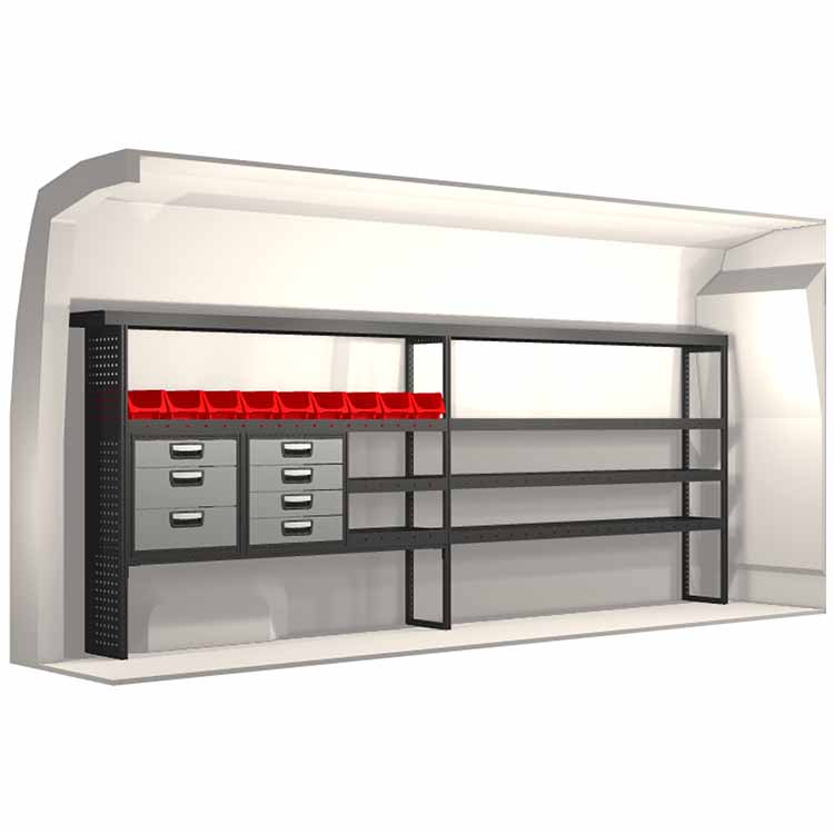 The racking has been specially designed to ensure the optimum fit to the vehicle, as well as the best possible functionality and safety. It has been developed for professional use, is flexible and is intended for service jobs in various types of business. All shelves are equipped with rubber mats, and all drawers with foam plastic liners. Assembly material is included.