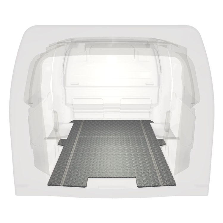 Lehká a robustní standardní podlaha do dodávky Citroën Jumpy / Peugeot Expert / Toyota ProAce s protiskluzovou hliníkovou deskou a nákladními kolejnicemi (podélnými) pro rychlou a bezpečnou montáž regálových systémů a dalšího příslušenství.
