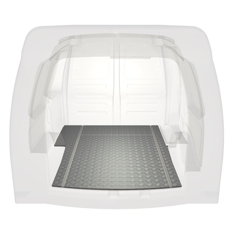 Lehká a robustní standardní podlaha do dodávky Volkswagen Caddy s protiskluzovou hliníkovou deskou a nákladními kolejnicemi (podélnými) pro rychlou a bezpečnou montáž regálových systémů a dalšího příslušenství.