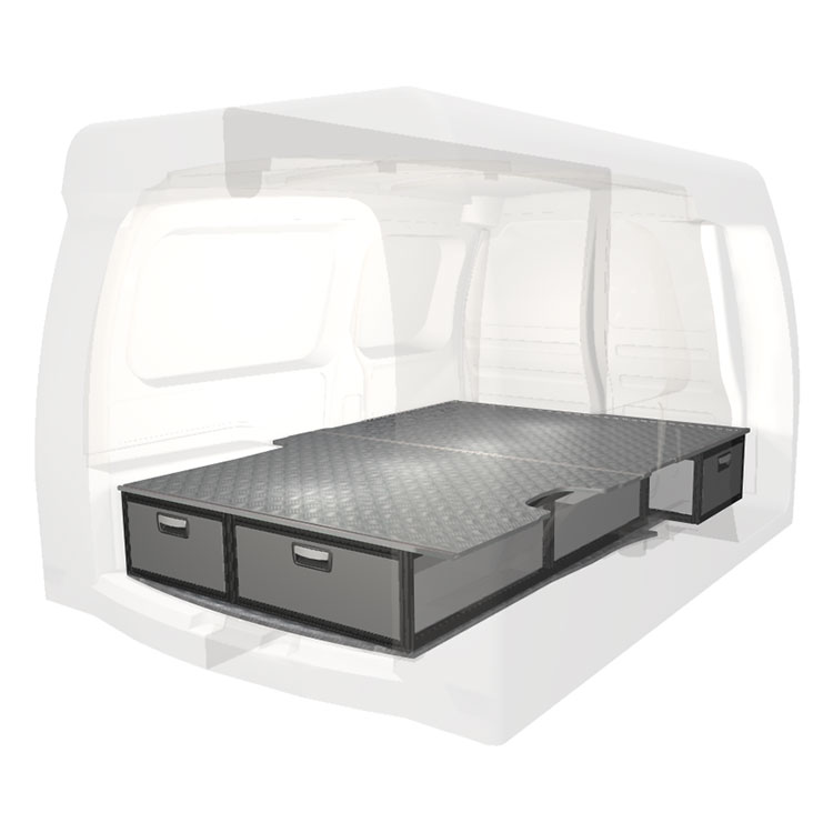 The kit is designed to be fitted on top of a Modul-Floor, utilizing the floor rails for a non-intrusive installation. The double floor is equipped with rails for easy installation of vehicle racking, and edging strips for a nice finish.