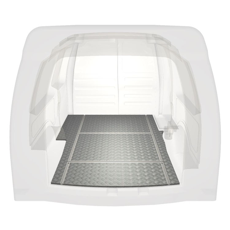 Lehká a robustní podlaha s příčnými kolejnicemi pro dodávky Volkswagen Caddy Maxi s protiskluzovou hliníkovou deskou a nákladními kolejnicemi (podélnými a příčnými) pro rychlou a bezpečnou montáž regálových systémů a dalšího příslušenství.