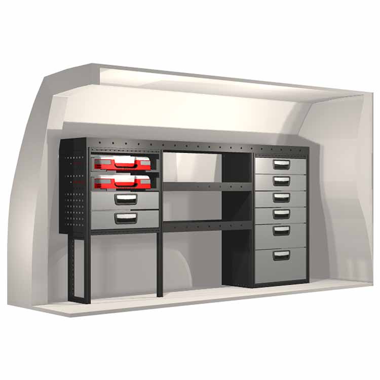 The racking has been specially designed to ensure the optimum fit to the vehicle, as well as the best possible functionality and safety. It has been developed for professional use, is flexible and is intended for service jobs in various types of business. All shelves are equipped with rubber mats, and all drawers with foam plastic liners. Assembly material is included.