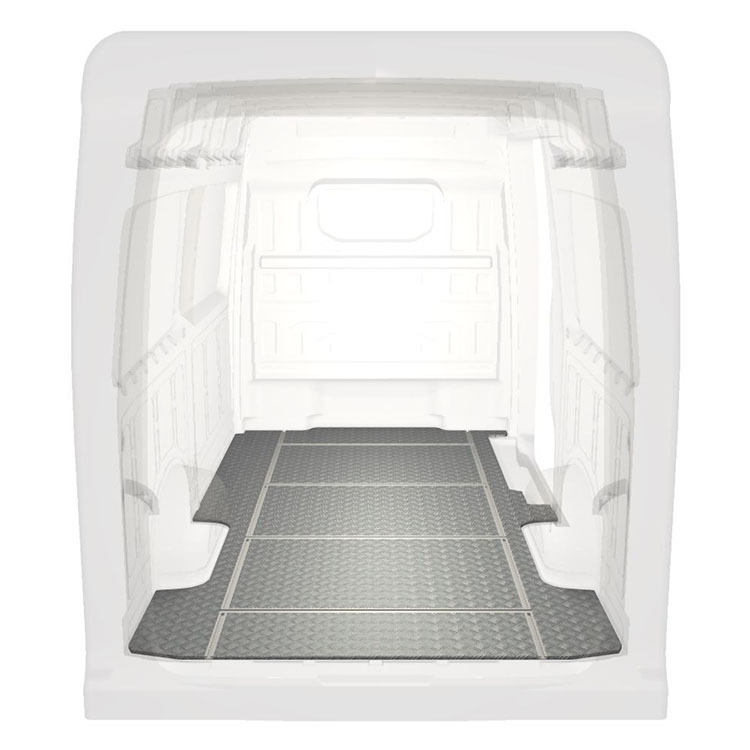 Lehká a robustní podlaha s příčnými kolejnicemi pro dodávky Volkswagen Crafter / MAN TGE s protiskluzovou hliníkovou deskou a nákladními kolejnicemi (podélnými a příčnými) pro rychlou a bezpečnou montáž regálových systémů a dalšího příslušenství.