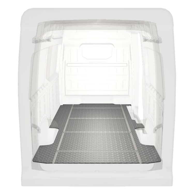 Lehká a robustní podlaha s příčnými kolejnicemi pro dodávky Volkswagen Crafter / MAN TGE s protiskluzovou hliníkovou deskou a nákladními kolejnicemi (podélnými a příčnými) pro rychlou a bezpečnou montáž regálových systémů a dalšího příslušenství.