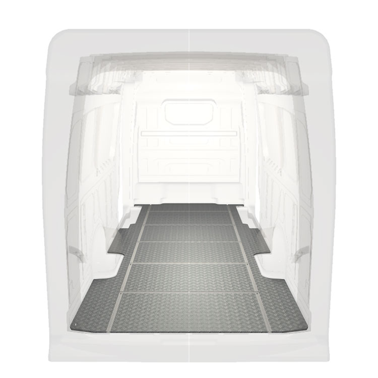 Lehká a robustní podlaha s příčnými kolejnicemi pro dodávky Volkswagen Crafter / MAN TGE s protiskluzovou hliníkovou deskou a nákladními kolejnicemi (podélnými a příčnými) pro rychlou a bezpečnou montáž regálových systémů a dalšího příslušenství.