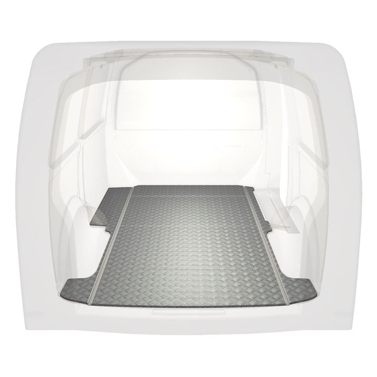 Lehká a robustní standardní podlaha do dodávky Volkswagen Transporter T6 s protiskluzovou hliníkovou deskou a nákladními kolejnicemi (podélnými) pro rychlou a bezpečnou montáž regálových systémů a dalšího příslušenství.