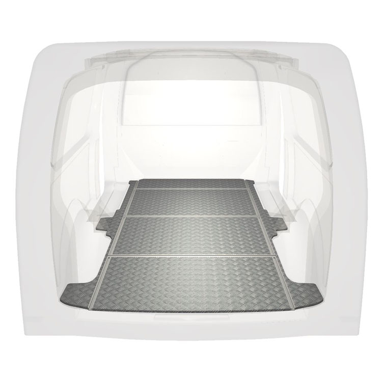 Lehká a robustní podlaha s příčnými kolejnicemi pro dodávky Volkswagen Transporter T6 s protiskluzovou hliníkovou deskou a nákladními kolejnicemi (podélnými a příčnými) pro rychlou a bezpečnou montáž regálových systémů a dalšího příslušenství.